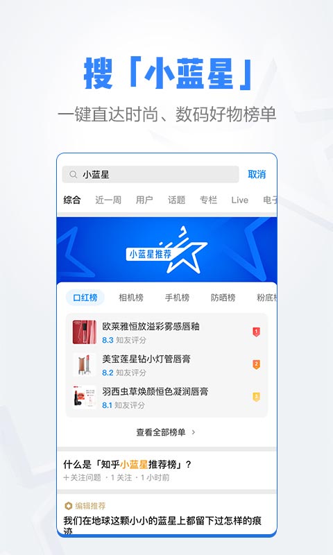 上知乎,搜「小蓝星」,快速获得客观中立的时尚、数码好物榜单。